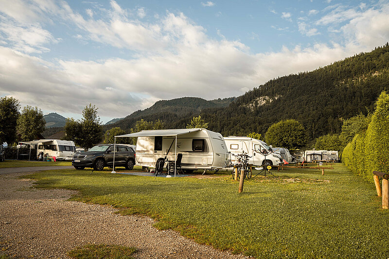 Die Kaiser-Stellplätze bieten außergewöhnlich viel Platz. Dank der weitläufigen Parzellierung eignen sie sich perfekt für größere Fahrzeuge oder Gäste, die Wert auf Komfort legen. Die ruhige Lage und der Blick auf die umliegende Bergwelt schaffen eine entspannte Atmosphäre für erholsame Urlaubstage.